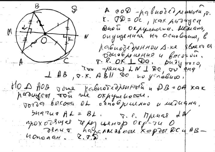 Докажите, что прямая, содержащая середины двух параллель- ных хорд окружности, проходит через её центр