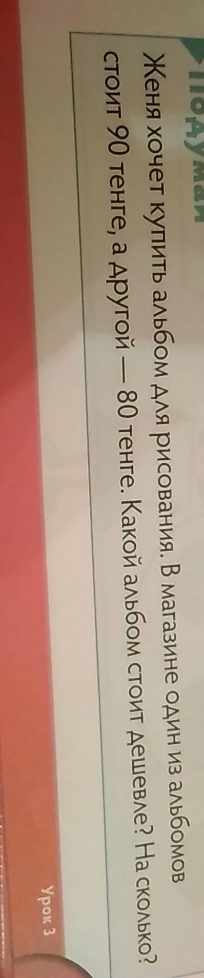решить задачу Женя хочет купить альбом для рисования. в магазине один из альбомов стоит90 тенге,а другой-80 тенге. какой альбом стоит дешевле? на сколько?