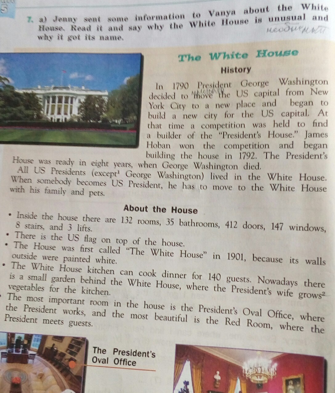 В 1790 году президент Джордж Вашингтон решил пренести столицу Соединенных штатов из Нью Йорка на новое место, и начал строить новою столицу Америки. В какой то момент было начато соревнование, чтобы выбрать строителя Президенстского дома. Джеймс Хован выиграл соревнование и начал строительство в 1792 году. Президентский дом был достроен через 8 лет после смерти Джорджа Вашингтона. Все американские президенты кроме Вашингтона жили в Белом доме. Когда кто - то становился президентом Америки, он селился в Белом доме вместе с семьей и домашними животными.
