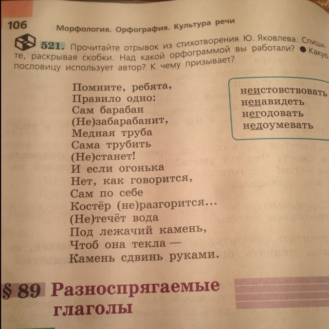 Предлог "не" отдельно. Мы работали над орфограммой : " Правописание не с глаголами" . Ну, какую пословицу использует автор я не знаю, но он призывает нас к труду, чтобы мы работали и не ленились.