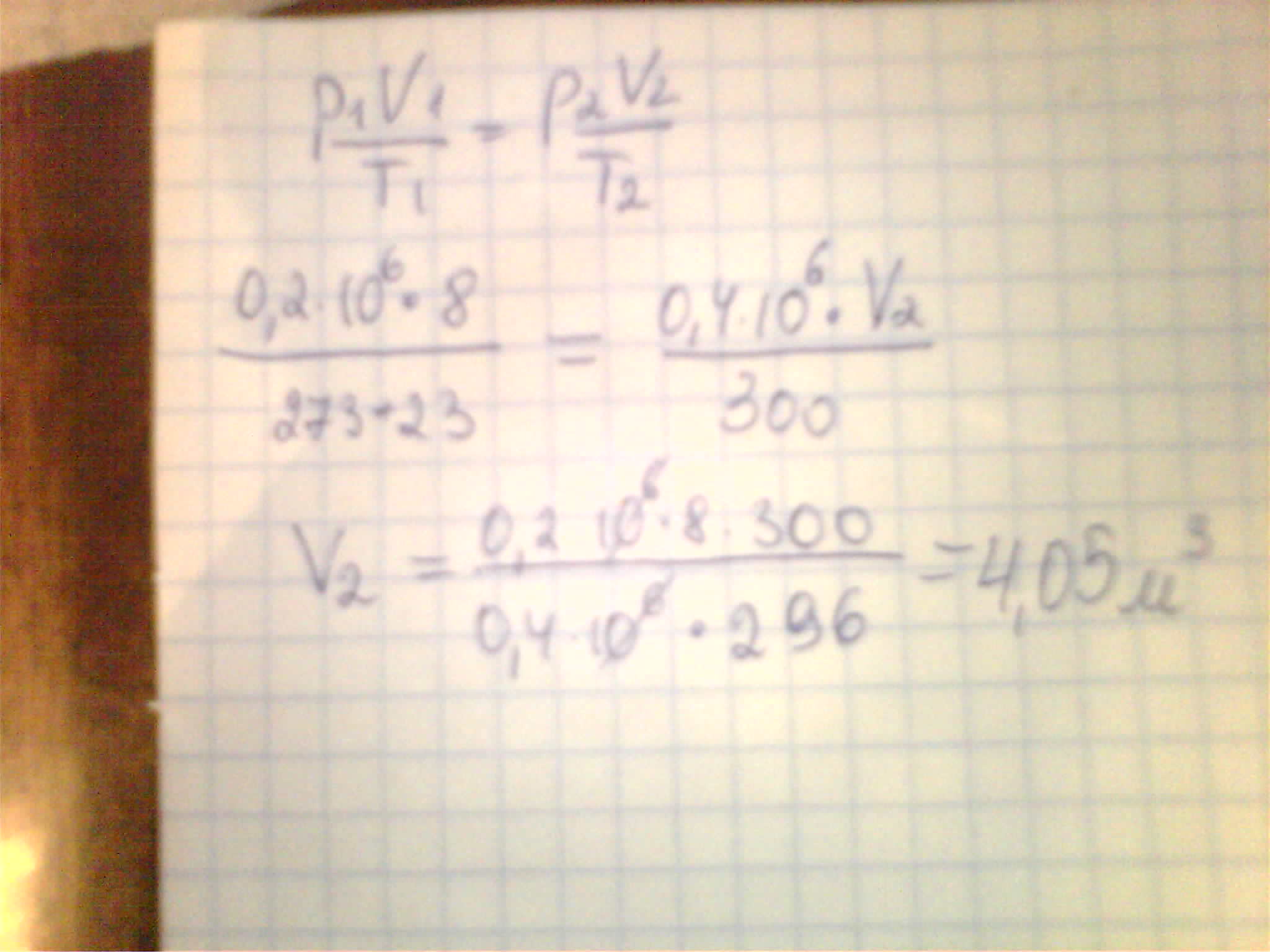газ массой 6 кг занимает объем 8м^3 при давлении 0,2 МПа и температуре 23 C какой объем будет занимать тот же газ массой 5кг при давлении 0,4 МПа и температурой 300к