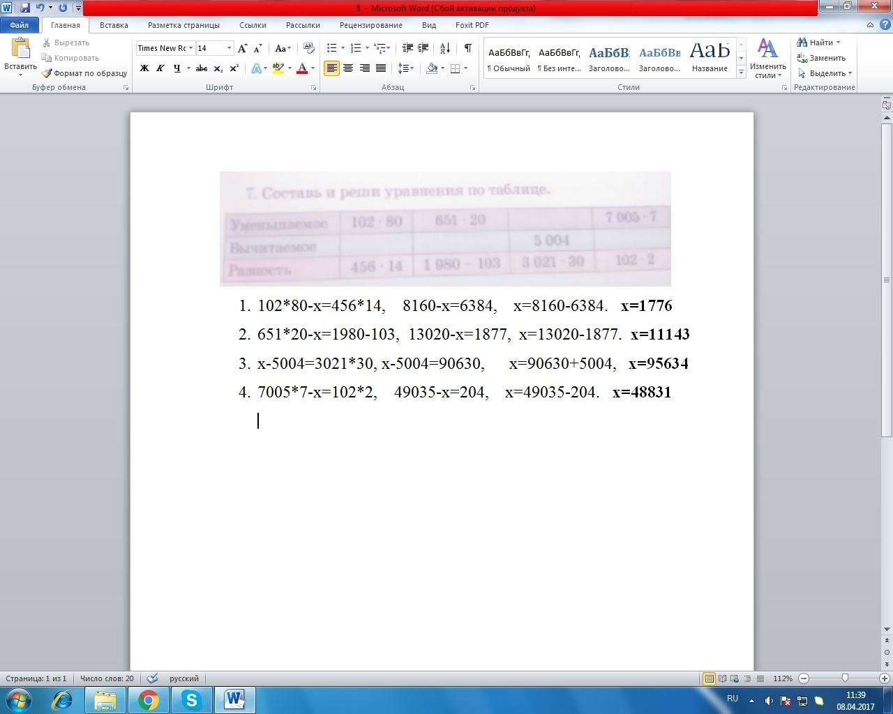 Составь и реши уравнения по таблице. Уменьшаемое 102*80. Вычитаемое. Разность 456*14