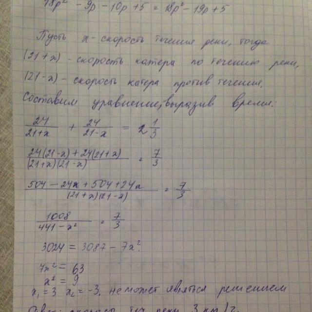Катер прошел 24 км. по течению реки и вернулся обратно, затратив на весь маршрут 2 ч. 20 мин. Какова скорость течения реки, если скорость катера в стоячей воде равна 21 км/ч?