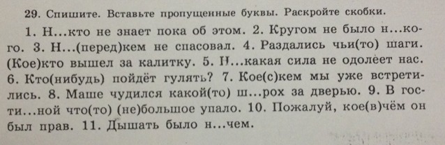 Никто,никого,не перед кем,чьи-то,кое-кто,никакая,кто-нибудь,кое с кем,какой-то,шорох,гостинной,что-то,небольшое,кое в чём,нечем.