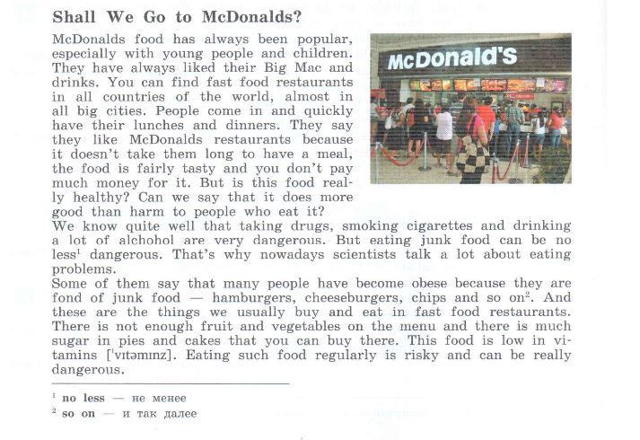 Еда в Макдональдсе всегда была популярной, особенно среди молодёжи и детей. Им всегда нравились в нем Биг Maки и напитки. Рестораны быстрого питания можно найти во всех странах мира, почти во всех крупных городах. Люди приходят сюда и быстро обедают или ужинают. Они говорят, что им нравятся рестораны Макдональдс, потому что не требуется много времени, чтобы поесть, еда довольно вкусная, и вы не платите за нее много денег. Но здоровая ли эта еда на самом деле? Можем ли мы сказать, что она приносит больше пользы, чем вреда, людям, которые ее едят?
