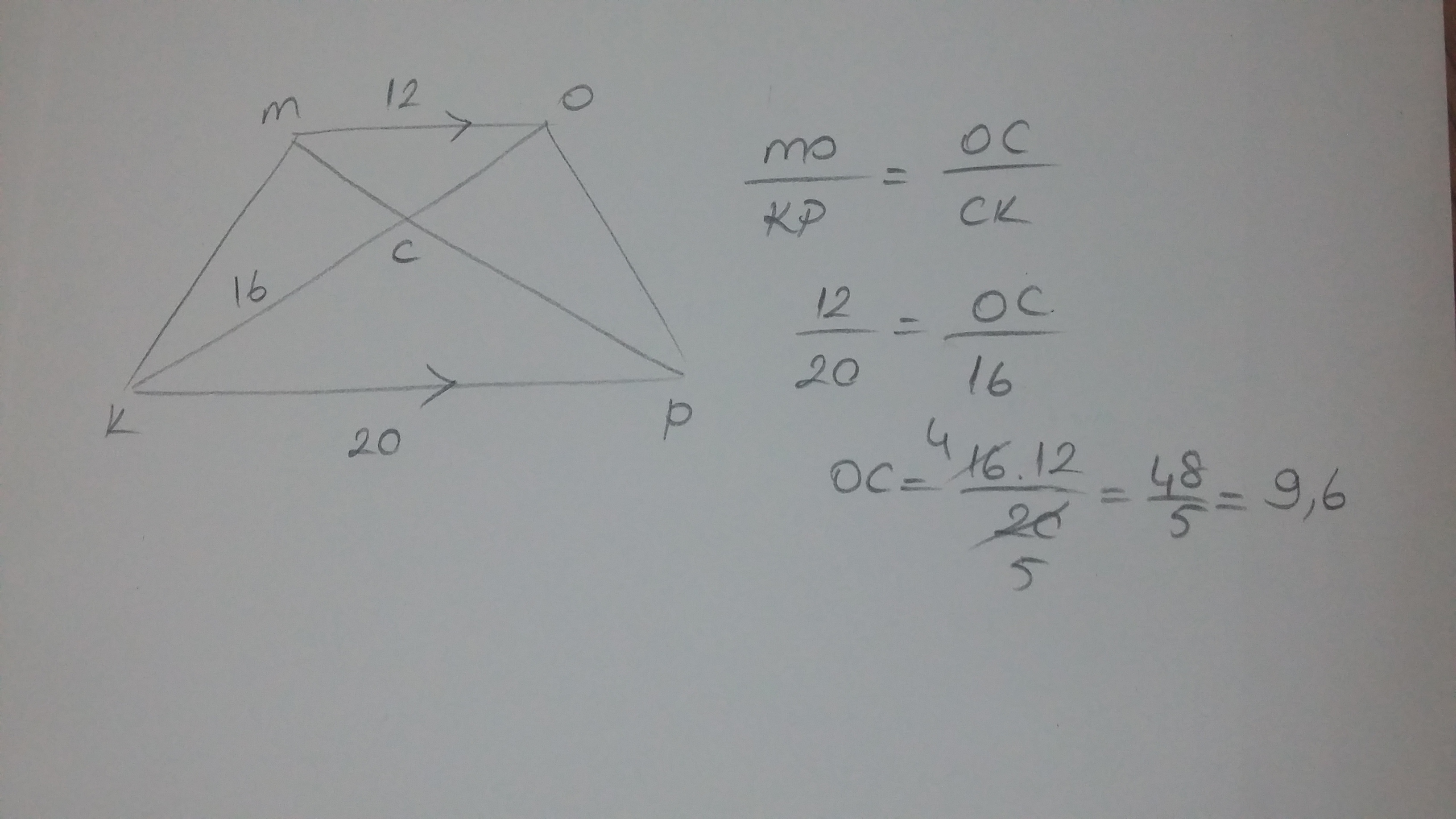 Тогда МО/КР= СО/КС. 12/20=СО/16. СО=12*16/20=96/10=9,6