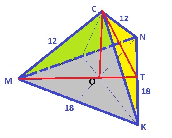 треугольник MKN равносторонний , со стороной 18 см.Точка С удалена от вершин треугольника на 12 см. найдите расстояние от точки С до плоскости MKN