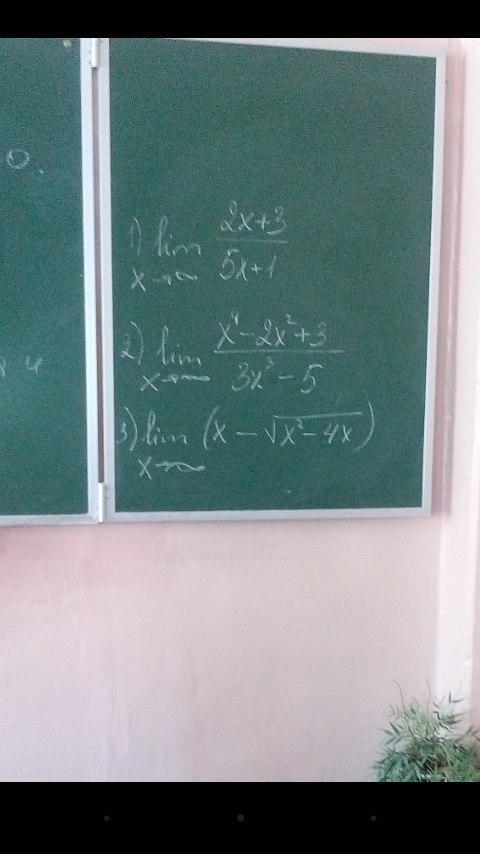 small lim_{xrightarrow infty }{2x+3over 5x+1}=lim_{xrightarrow infty }{2xover 5x}=lim_{xrightarrow infty }{2over 5}={2over5}\\ lim_{xrightarrow infty }{x^4-2x^2+3over3x^3-5}=lim_{xrightarrow infty }{x^4over3x^3}=lim_{xrightarrow infty }{xover3}=infty\\ lim_{xrightarrow infty }(x-sqrt{x^2-4x})=lim_{xrightarrow infty }{(x-sqrt{x^2-4x})cdot(x+sqrt{x^2-4x})over(x+sqrt{x^2-4x})}=lim_{xrightarrow infty }{x^2-x^2+4xover x+sqrt{x^2-4x}}=4lim_{xrightarrow infty }{xover x+sqrt{x^2-4x}}=4lim_{xrightarrow infty }{xover x+sqrt{x^2}}=4lim_{xrightarrow infty }{xover 2x}=4cdotlim_{xrightarrow infty }{1over 2}=4cdot{1over2}=2