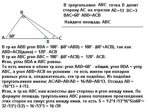 в треугольнике abc точка d делит сторону ac на отрезки ad=13 dc=3 bac=60 abd=acb Найдите площадь ABC