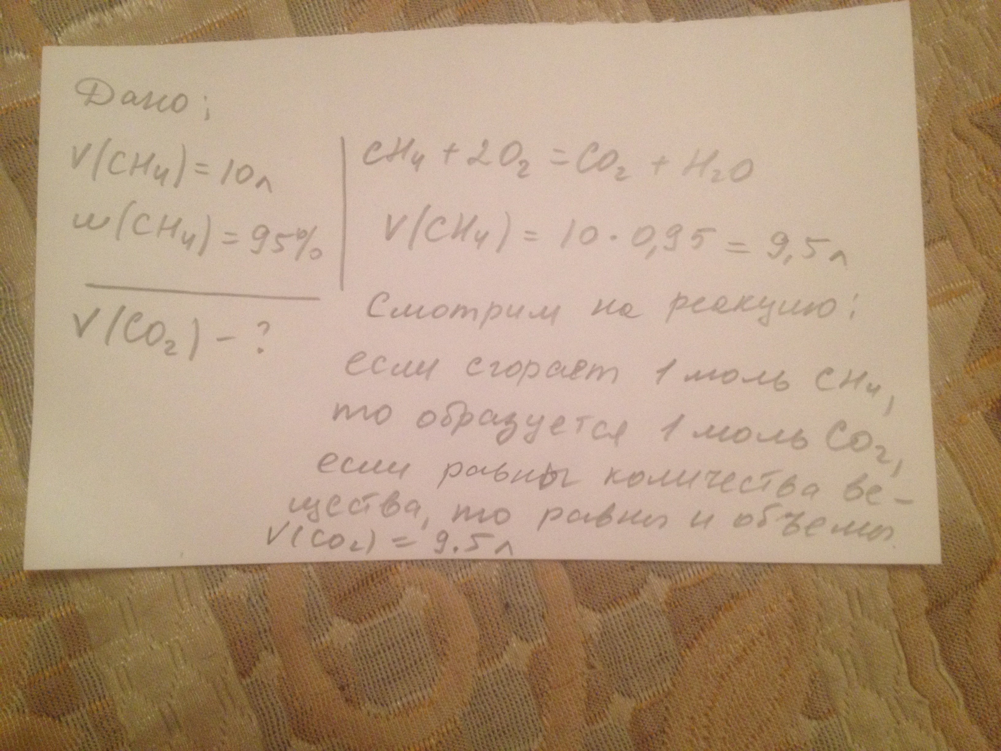 Добрый вечер! Хочу задать вопрос по химии. Задача не сложная, но никак не могу догадаться, как правильно её решить! Какой объём газа выделится при сгорании 10 литров газа, содержащего 95 % CH4. Огромное спасибо!