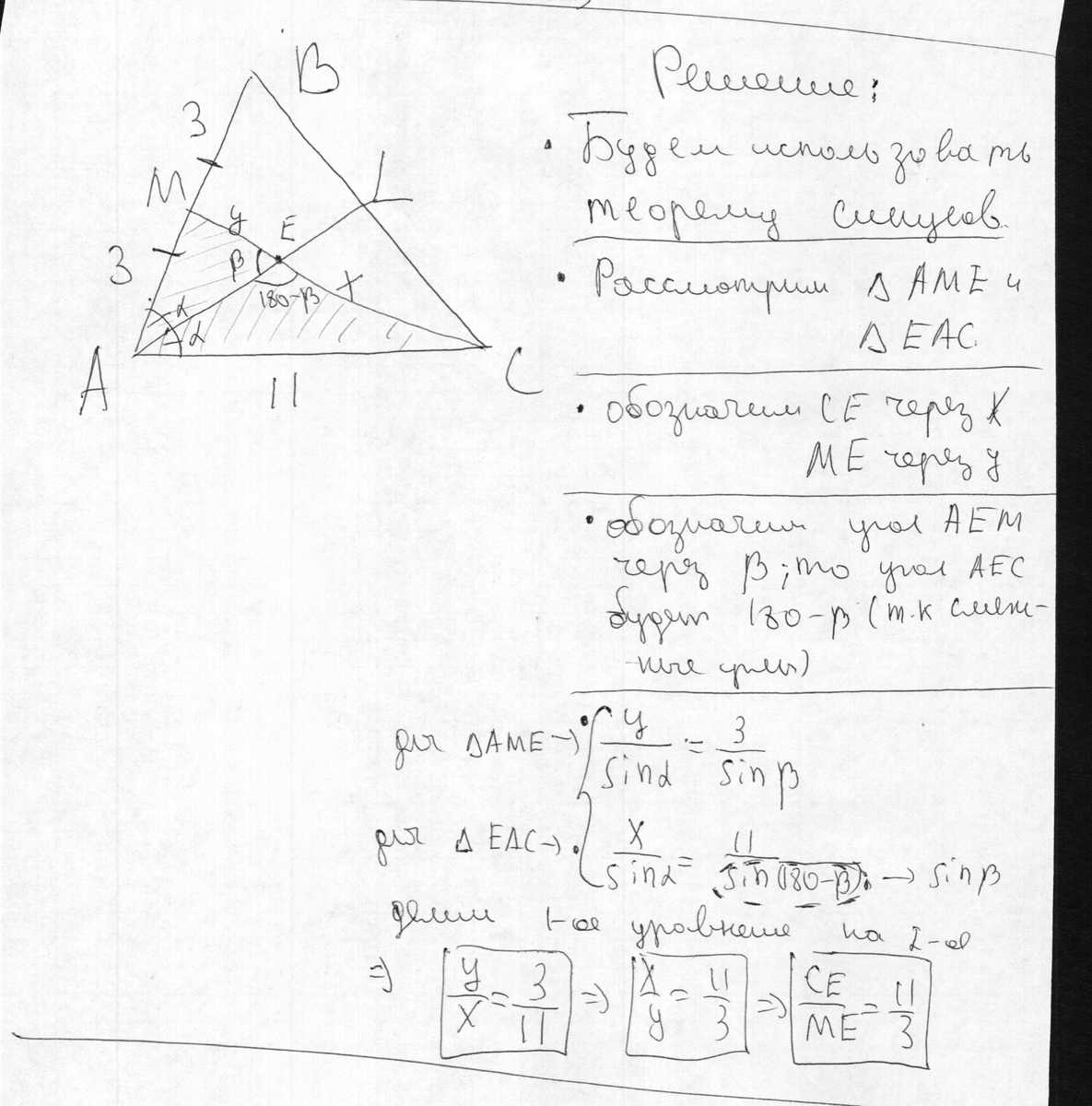В треугольнике АВС: АВ=6; АС=11. Биссектриса АL и медиана СМ пересекаются в точке Е. Найти СЕ и ЕМ