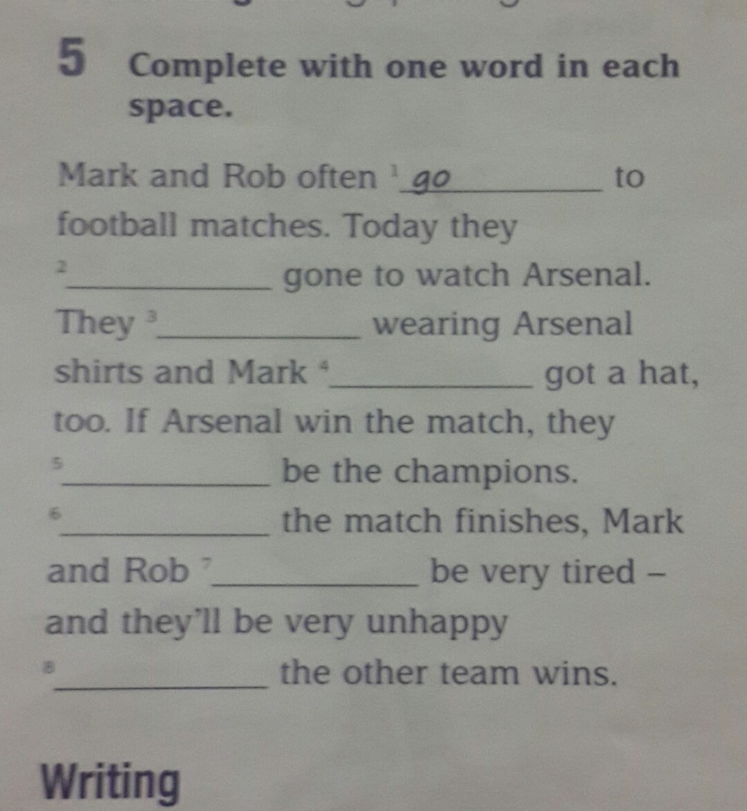 1 ...Have gone... 2 they was wearing Arsenal ...Mark had got....3 ...will be the champions 4 When....will be very tired and ... if the other team wins.