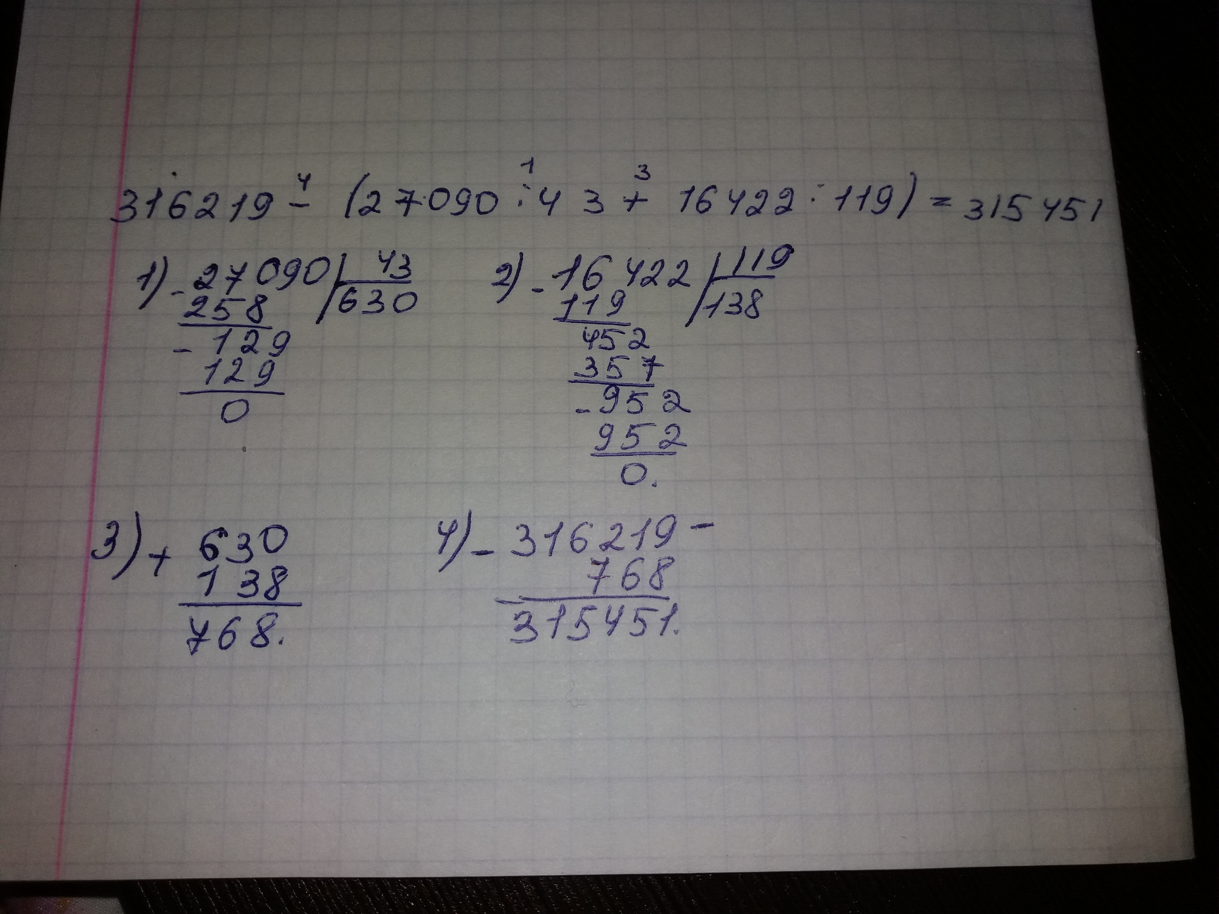 Найдите значение выражения 316219 − (27090 : 43 + 16422 : 119).