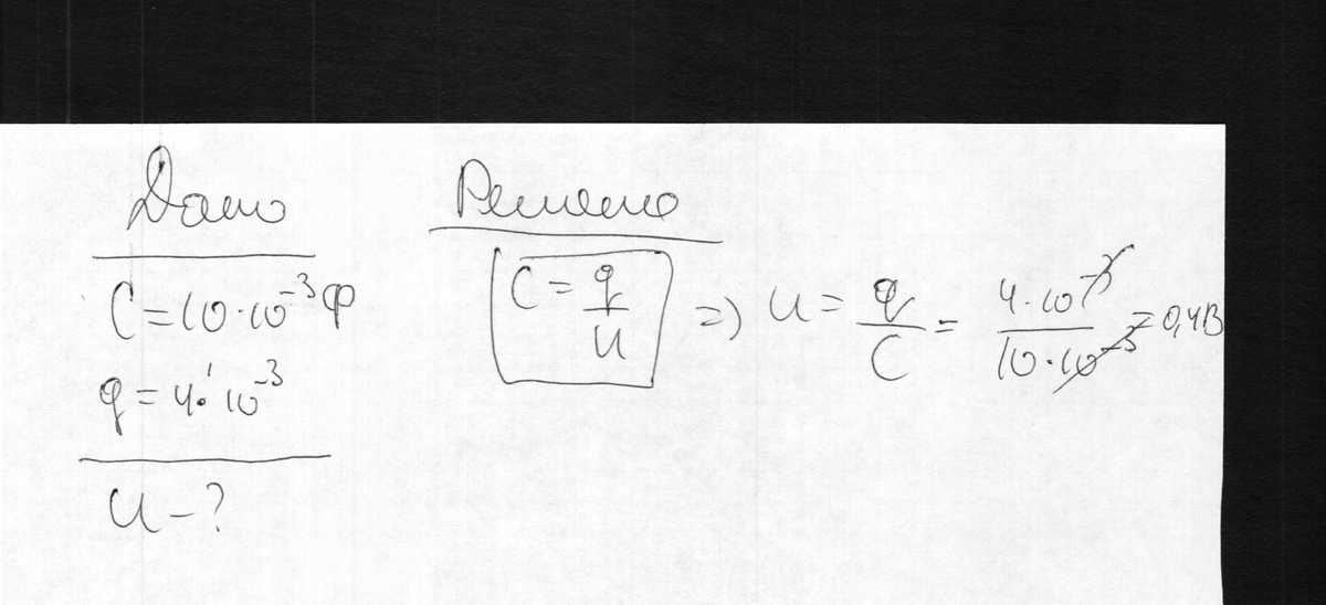 U=q/C=4*10^(-3)/10*10^(-3)=0.4 В