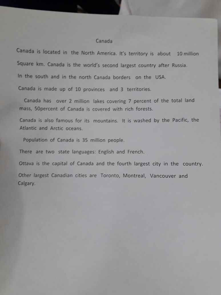 Канада расположена в Северной Америке. Ее площадь примерно равна 10-ти миллионам квадратных километров. Канада занимает 2 место в мире по площади после России. На юге и на севере Канада граничит с США. Канада состоит из 10 провинций и 3 областей. В Канаде находятся более 2 миллионов озер, покрывающих 7 % всей территории, 50 % всей территории Канады покрыты густыми лесами. Канада также популярна за ее горы. Она омывается Тихим, Атлантическим и Северо-ледовитым океанами. Население Канады: 35 миллионов человек. В ней 2 государственных языка: английский и французский. Оттава является столицей Канады и является 4-ым самым большим городом в стране. В Канаде также есть города: Торонто, Монреаль, Ванкувер и Калгари.