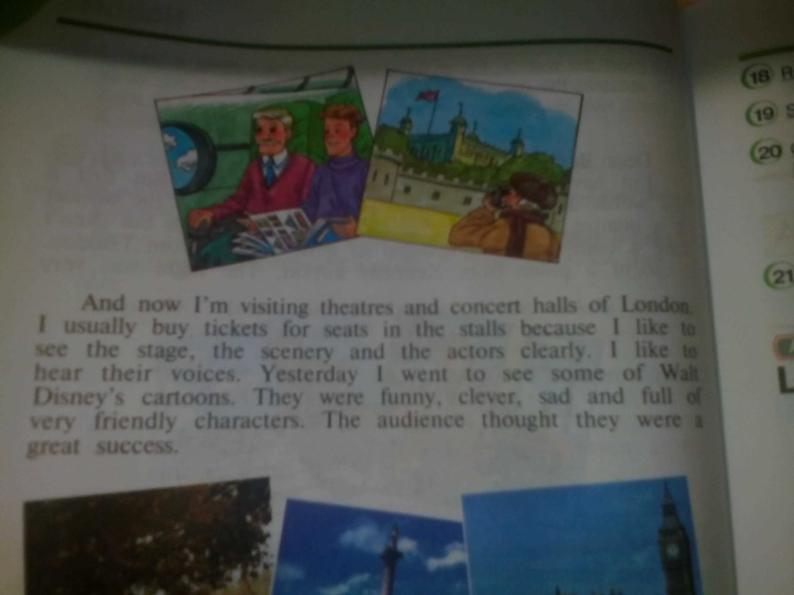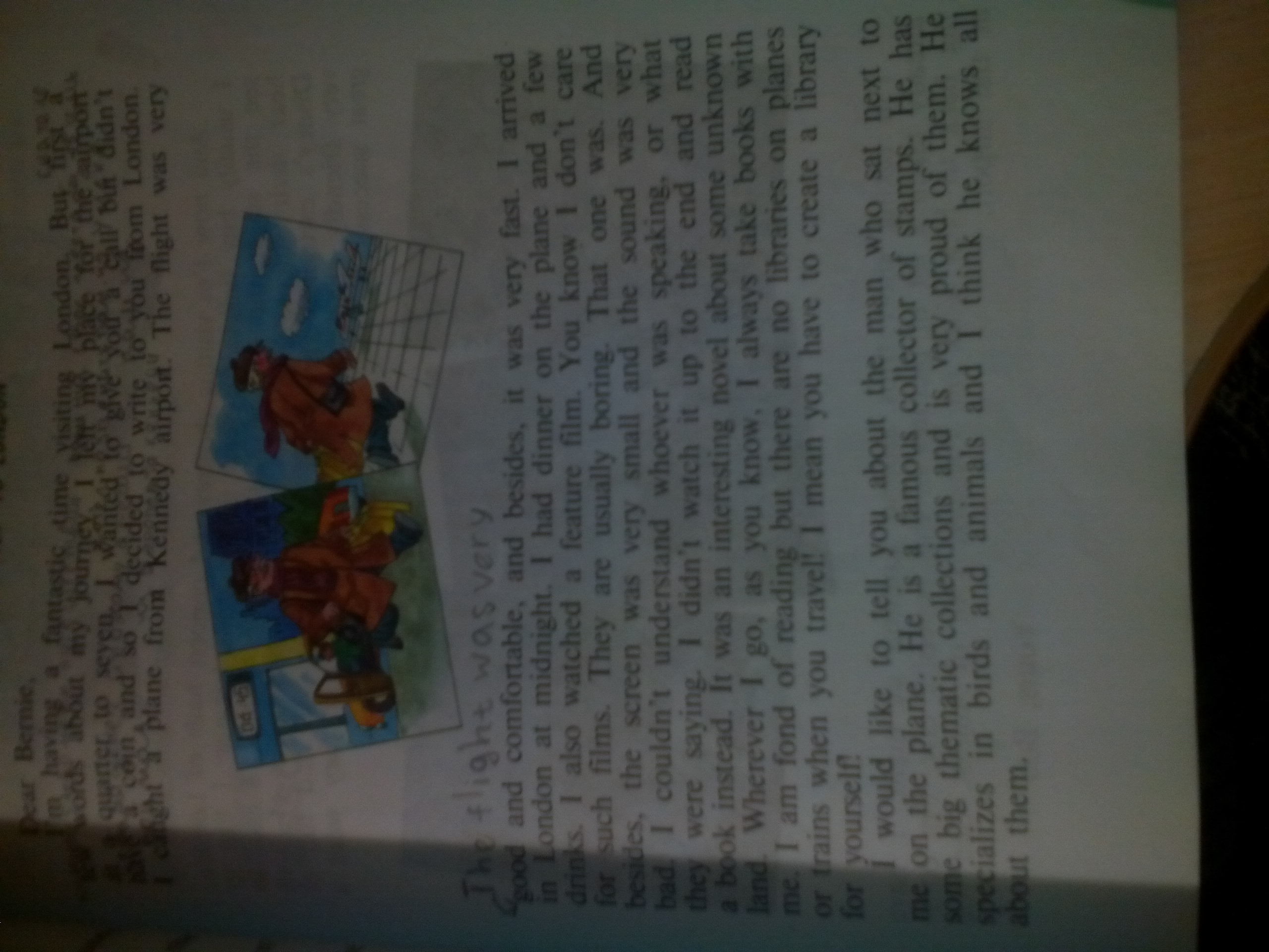 Я бы хотела рассказать тебе о мужчине кто сидел впереди меня в самолёте. Это был популярный коллектор марок. У него были большие тематические коллекции и очень горд в этом. Он специализируется в птицах и животных и я думаю он знает всё о них.И сейчас я посещаю театры и концерты Лондона. Я обычно покупаю билеты для сидений в кабинках потому-что я люблю смотреть на сцену и актёров полностью. Я люблю слушать их голоса. Вчера я ходила посмотреть на мультики от Волт Диснея. Они были веселыми,умными, печальными и полными дружелюбных героев. Аудитория сказали что они имеет огромный успех.