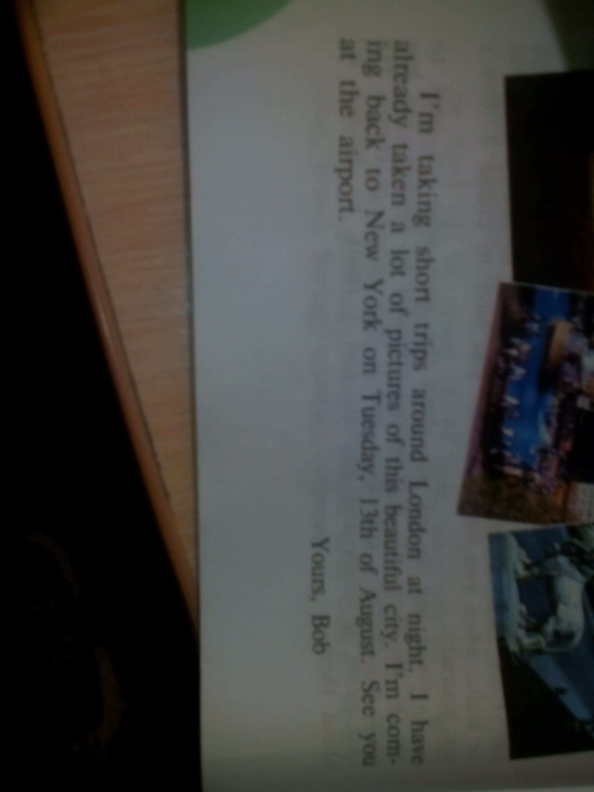 Я беру короткие поездки вокруг Лондона ночью. Я уже сделала много картин этого прекрасного города. Я возвращаюсь в Нью-Йорк во Вторник, 13 августа. Увидимся в аэропорте. Боб.