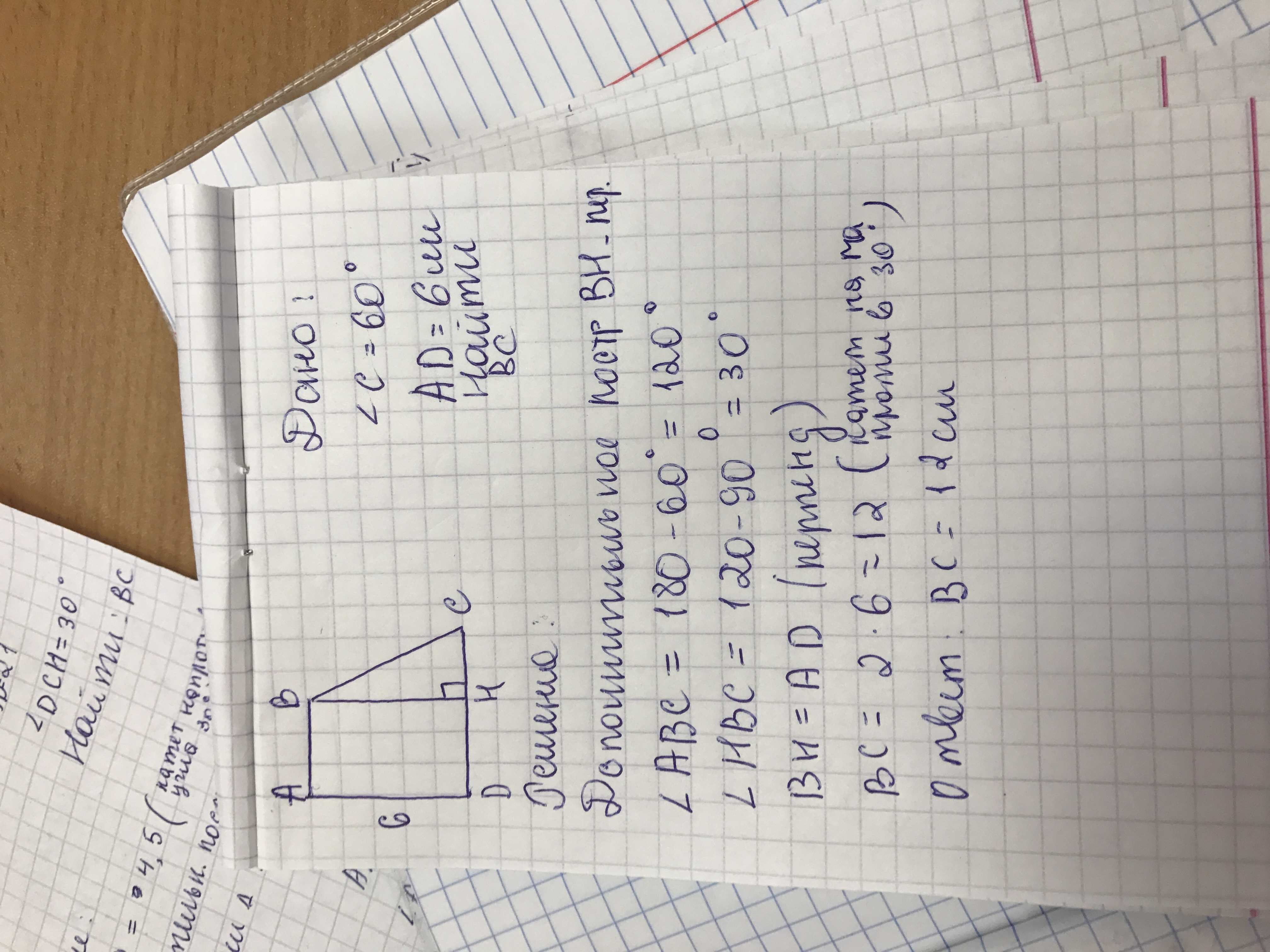 ABCD - прямоугольная трапеция, AD перпендикуляр AB, AD перпендикуляр DC, AD = 6см, угол BCD = 60 градусов. Найдите BC.