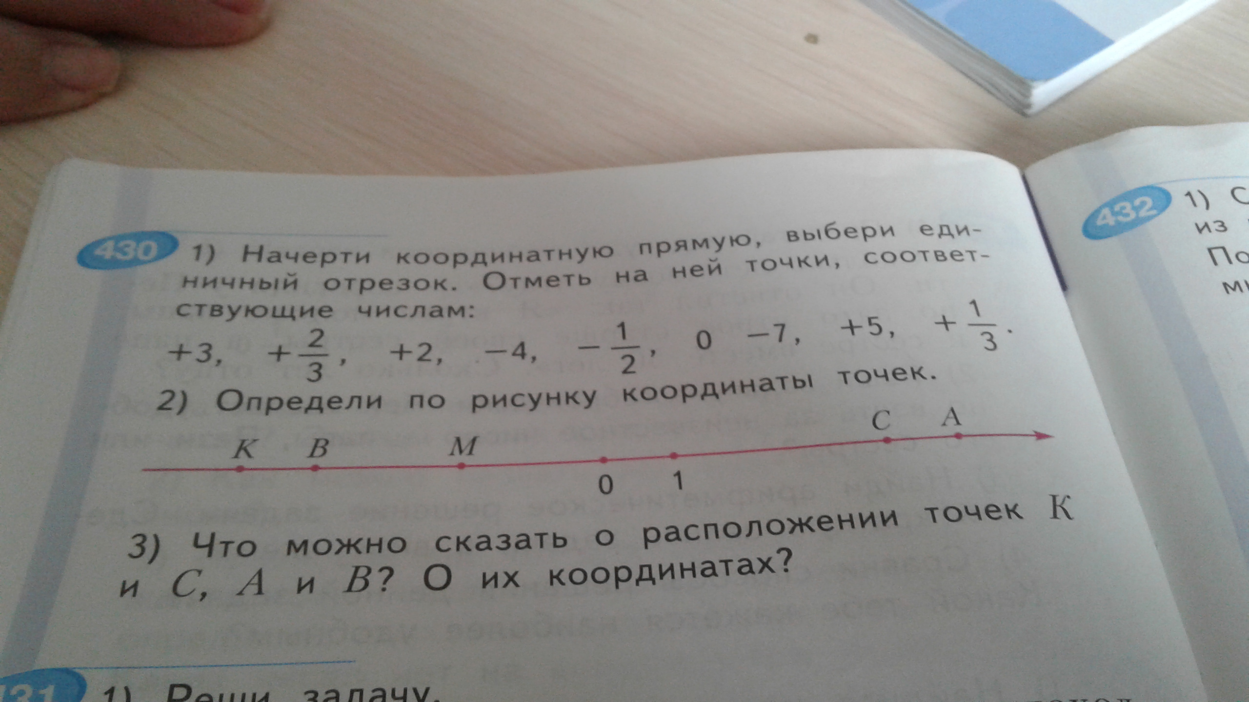 1) начертить прямую, посредине поставить точку (координату ) 0, через две клетки (1 см) вправо координату 1, влево от нуля - координату -1, линейкой от нуля вправо 2см, 3 см, 5см (каждую от нуля), влево -4 и -7, между 0 и 1 сперва 1/3 потом 2/3 (не доходя до пол см и немного больше пол-см.) вверху над цифрами поставить буквы