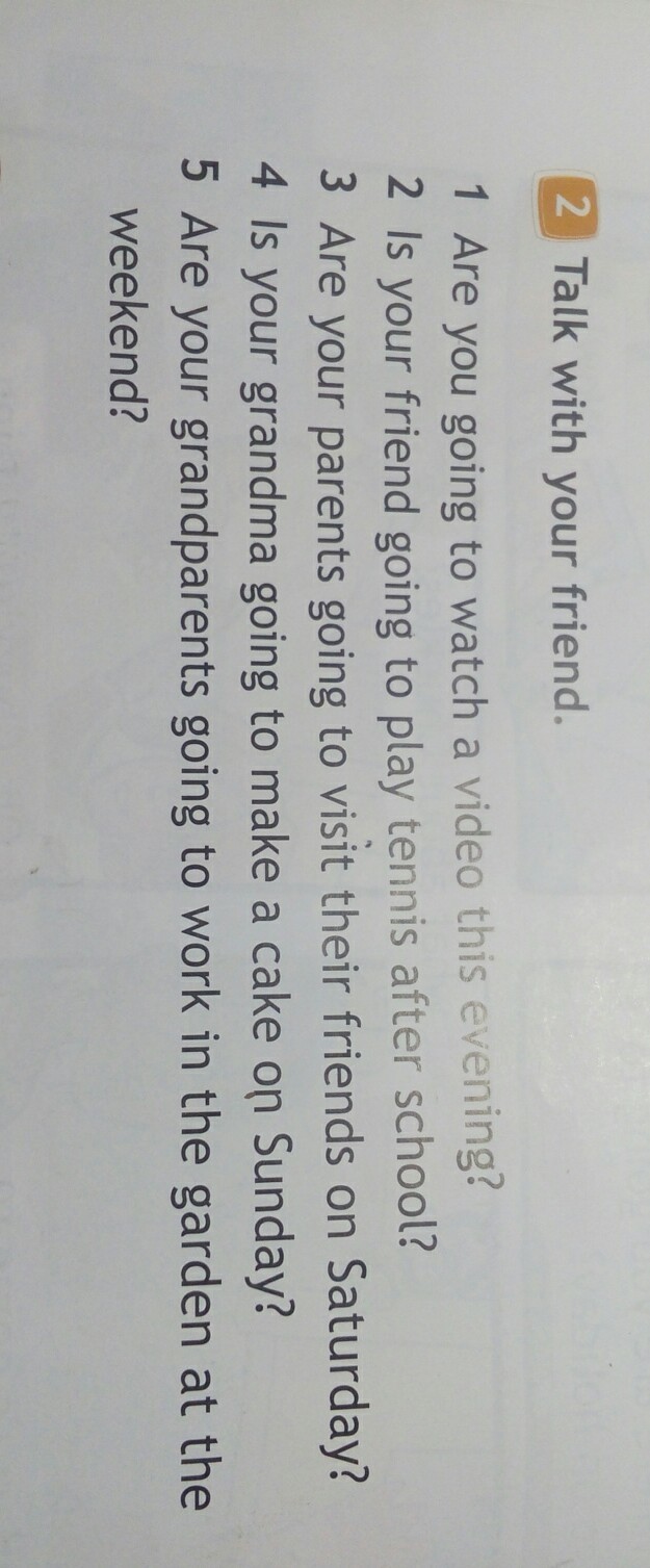 Собераешься ли ты смотреть видео этим вечером? 2) Соберается ли твой друг играть теннис после школы? 3) Собераются ли твои родители поситить твоиx друзей в субботу? 4) Соберается ли твоя бабушка сделать торт в воскресенье? 5) Собераются ли твои бабушка и дедушка работать в саду на выxодные