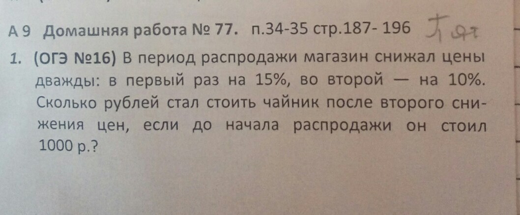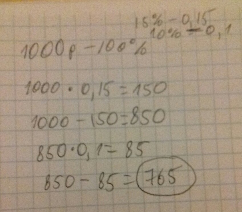 Переводишь проценты, умножаешь и не забываешь, что новая цена - 100%. Ответ 765.
