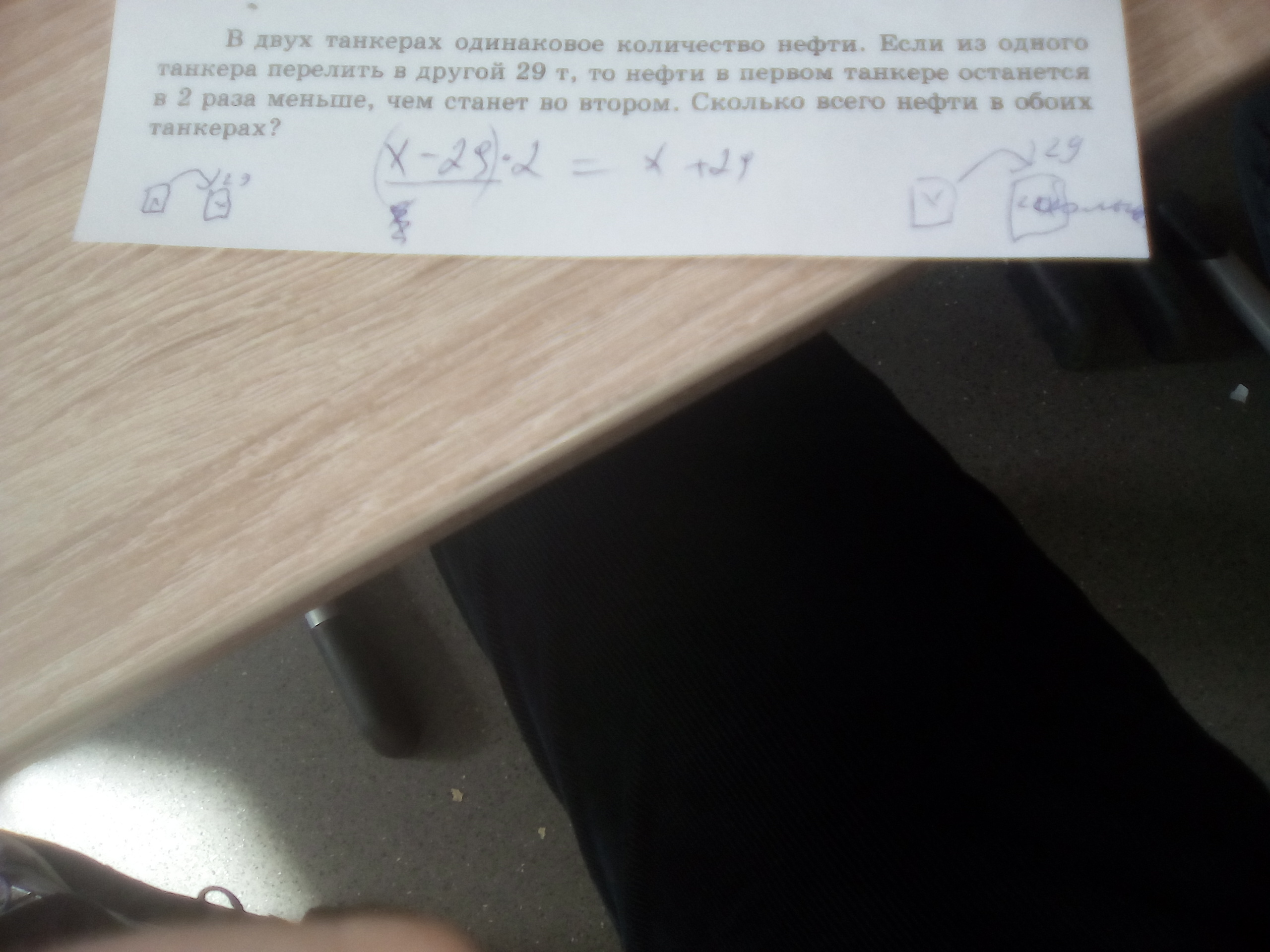 Примем что в обоих танкерах по х тонн нефти , то тогда : по условию задачи имеем : (х - 29) *2 = (х + 29)