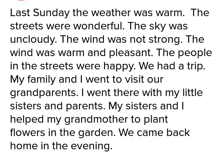 В прошлое воскресенье погода была теплая.Улицы были прекрасны.Небо было без облачное.Ветер был не сильным.Ветер был теплым и приятным.Люди на улицах были счастливы.У нас была поездка.Моя семья и я посетили наших бабушку и дедушку.Я поехал туда с моей маленькой сестрой и родителями.Моя сестра и я помогали моей моей бабушке сажать цветы в саду.Мы вернулись домой вечером.