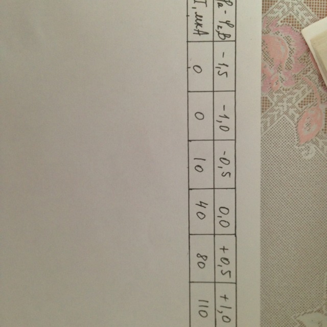 В таблице представлены результаты измерений фототока в зависимости от разности потенциалов между анодом и катодом на установке по изучению фотоэффекта. Точность измерения силы тока равна 5 мкА, разности потенциалов 0,1 В. Фото катод освещается монохроматическим светом с энергией фотонов 4,8 эВ. Чему равна работа выхода фотоэлектронов с поверхности фото катода?