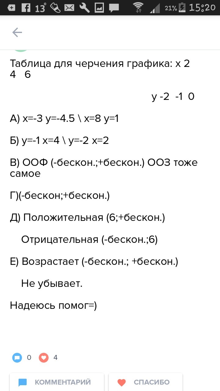 Постройте график функций y=0.5x+3. По графику определите:1) при каких значениях аргументах x значения функций y положительны;2) при каких значениях аргументах x значения функций y отрицательны?Ответ запишите в числовых промежутков.