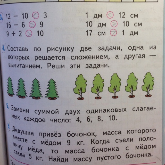 5-4=1(шт)деревьев больше берёз,чем ёлок.