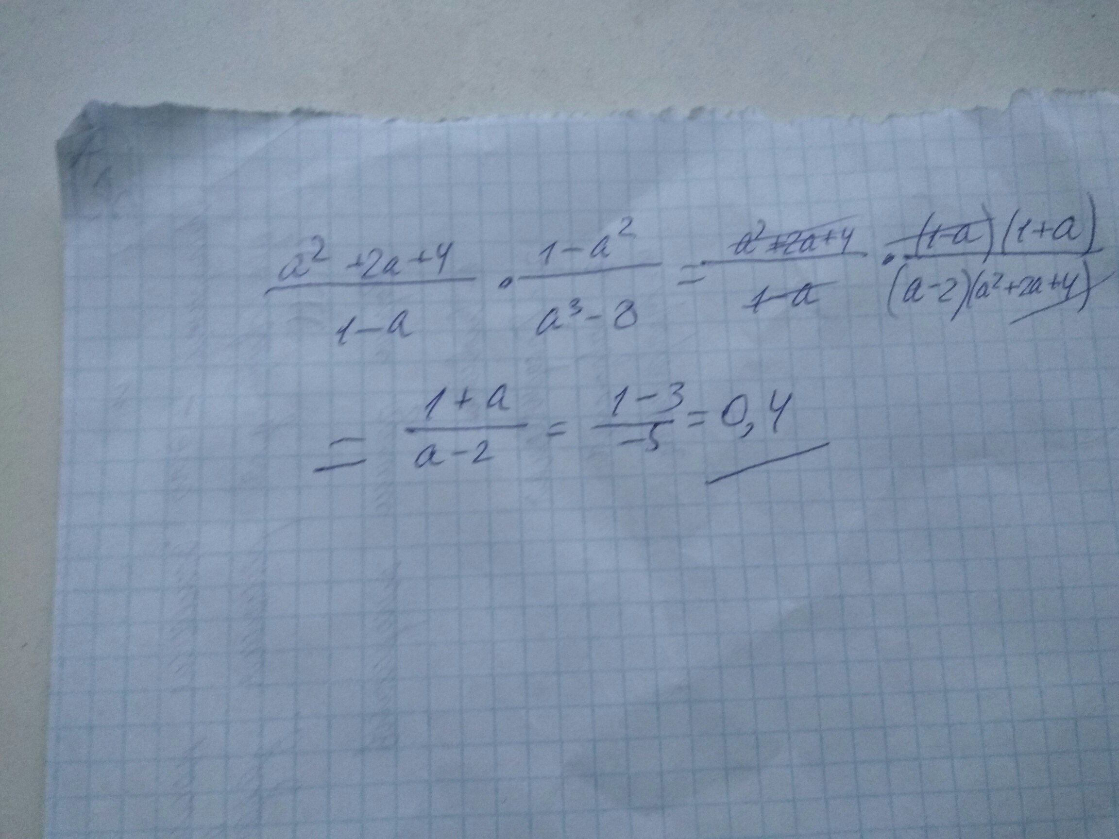 (a^2+2a+4/1-a)*(1-a^2/a^3-8)=(a^2+2a+4/1-a)*((1-a)*(1+a)/(a-2)*(a^2+2a+4))=1+a/a-2 при а= -3