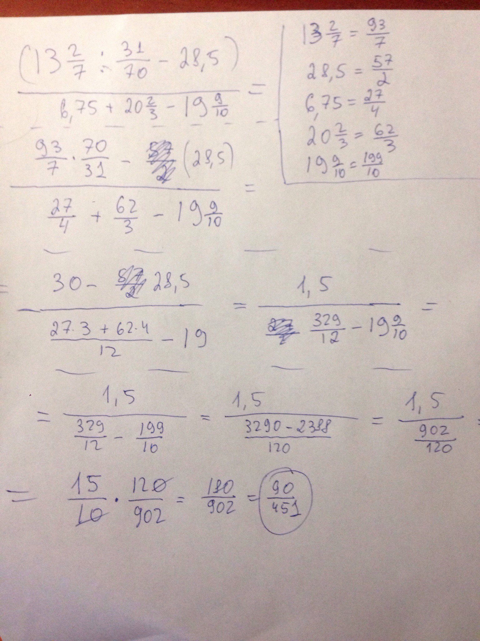 Решите пример: ( 13 2/7 : 31/70 - 28,5) : 6,75 + 20 2/3 - 19 9/10