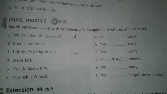 2c mustn’t 3f mustn’t 4e must 5a must 6b mustn’t