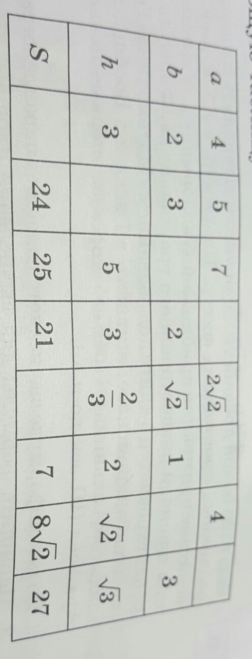 пусть s - площадь тропеции, a и b - основание, h - высота, проведенная к основанию. заполните следующую таблицу: