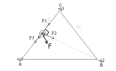 В вершинах равностороннего треугольника ABC со стороной 10 см находятся точечные заряды q(A)= -2*10(-9) Ku, q(B)=-14*10(-9)Ku, q(C)= -6*10(-9) Ku. Найти величину и направление силы, действующей на заряд 1*10(-9) Ku, расположенный в середине стороны AC