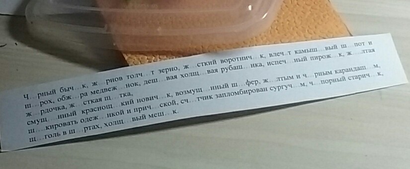 черный бычок, жёрнов толчет зерно, жесткий воротничок, влечет камышовый шепот и шорох, обжора медвежонок, дешевая холщовая рубашка, испеченный пирожок, желтая жердочка, жесткая щетка, смущенный краснощекий новичок, возмущенный шофер, желтым и черным карандашом, шокировать одежонкой и прической, счетчик запломбирован сургучом, чопорный старичок, щеголь в шортах, холщовый мешок