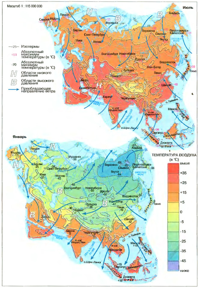 С продвижением от Атлантики на восток западный перенос слабеет, становится холоднее. Особенно охлаждается центральная часть материка, где средняя температура составляет -24 °С, а морозы часто достигают и -40 °С. Вследствие этого здесь образуется область высокого давления — Азиатский максимум. Отсюда континентальные умеренные воздушные массы растекаются во все направления. Особенно мощные воздушные потоки движутся к Тихому и Индийскому океанам, над которыми в это время уже сформировались области пониженного атмосферного давления. Так возникает сухой и холодный зимний муссон.