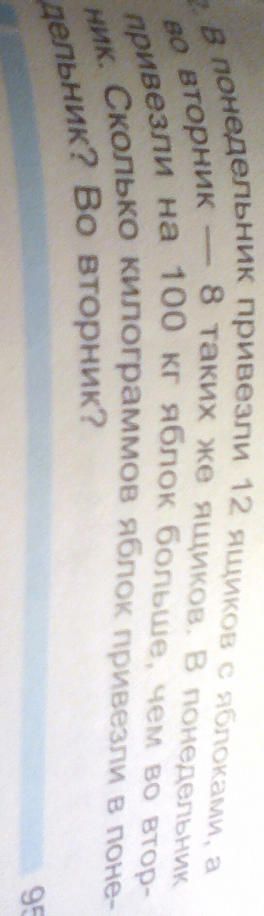 12-8=4,100 раздели на четыре=25,25 умножь на 12=300,25 на 8=200,Ответ в пон превизли 300кг,а в втр 200кг