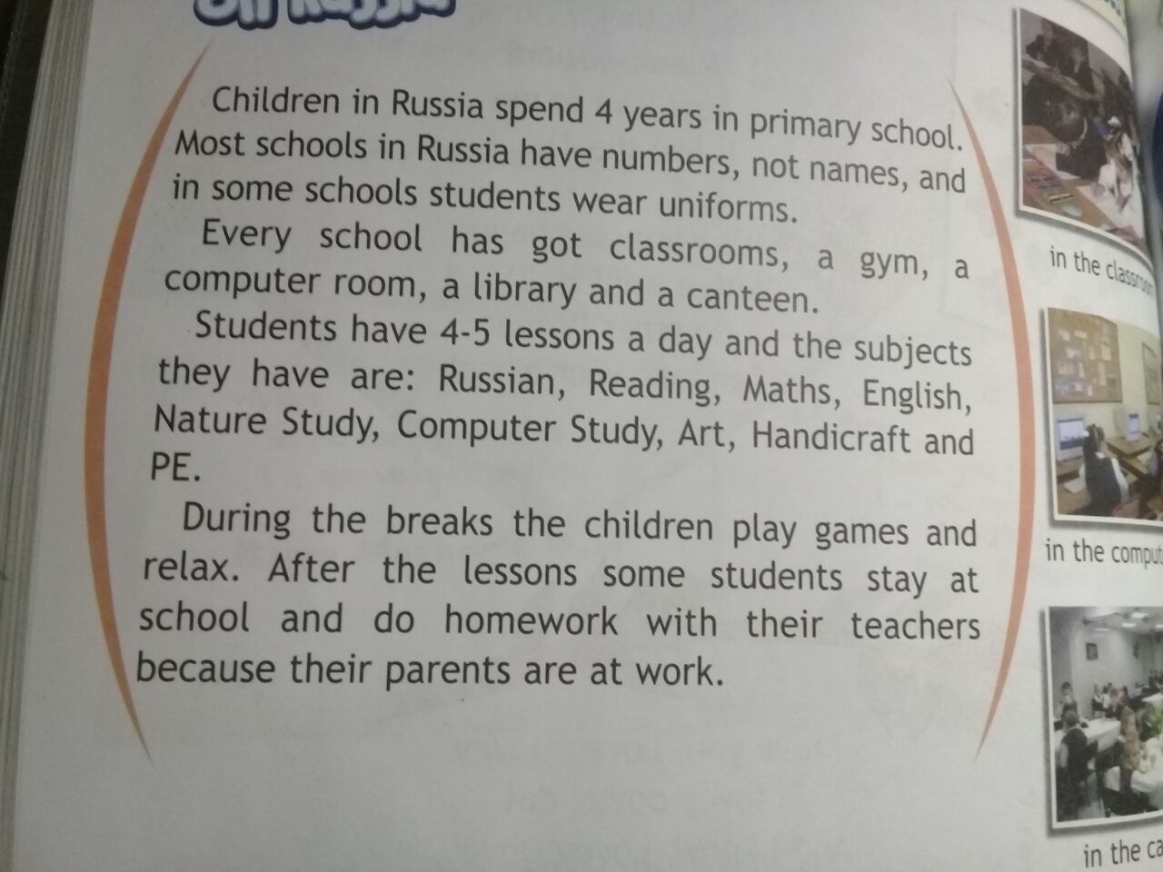 Дети в России учатся 4 года в начальной школе. У многих школ есть номера, но не названия, и в некоторых школах ученики носят школьную форму. В каждой школе есть кабинеты, спортзал (физкультурный), комната с компьютерной техникой , библиотека и столовая. У учеников по 4-5 уроков в день и предметы, которые у них есть это: русский, литературное чтение, математика, английский, окружающий мир, информатика, художественное искусство (ИЗО), руколепие (технология, лепка) и физкультура. В течение перемен дети играют в игры и отдыхают. После уроков ученики остаются в школе и делают уроки с учителями, потому что их родители на работе.