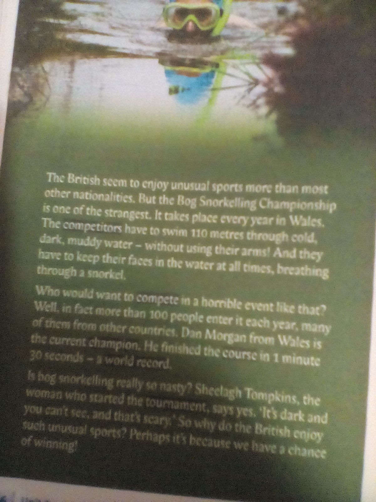 1 The competition takes place in Wales 2 The competitors have to swim 110 metres 3 More than 100 competitors enter each year. 4 The fastest time ever is 1 minute 30 seconds 5 Sheelagh Tompkins is the woman who started the competition 6 Sheelagh Tompkins said that it was scary because it was dark and you couldn’t see