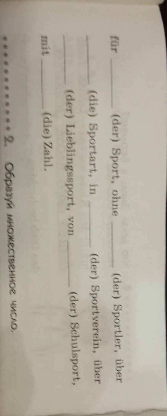 für den Sport; ohne den Sportler; über die Sportart; in (куда?) den Sportverein; über den Lieblingssport; von dem Schulsport; mit der Zahl.