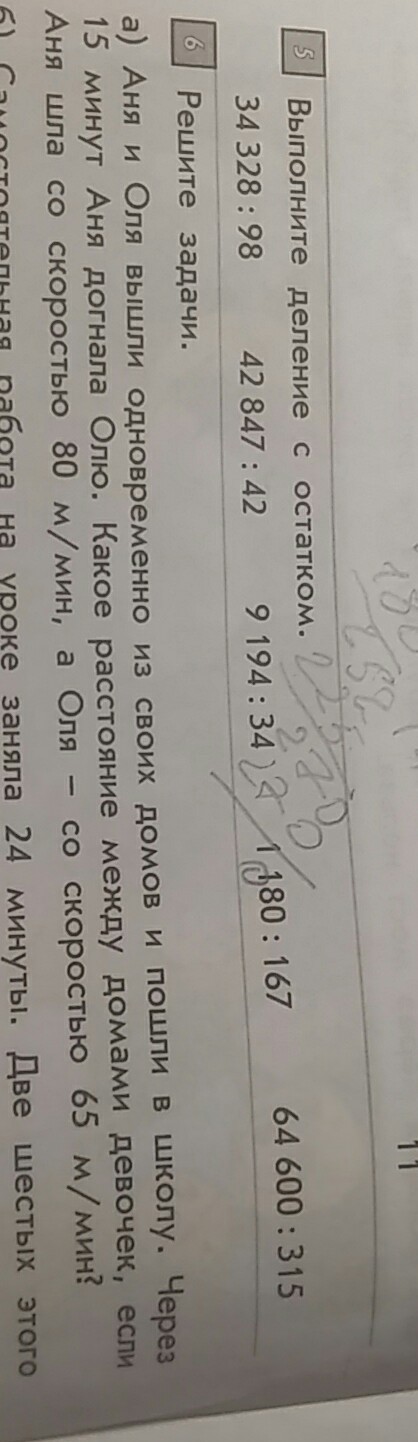 80м/мин*15мин=1200м это расстояние от школы до дома Ани 65м/мин*15мин=975м это расстояние от шкоы до дома Оли теперь можно рассчитать что 1200м-925м=225м это расстояние между домами девочек.