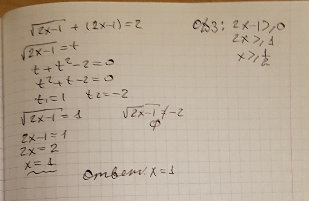 √(2x-1)+(√(2x-1))² =2 замена √(2x-1)=а а≥0 ОДЗ 2х-1≥0 х≥1/2