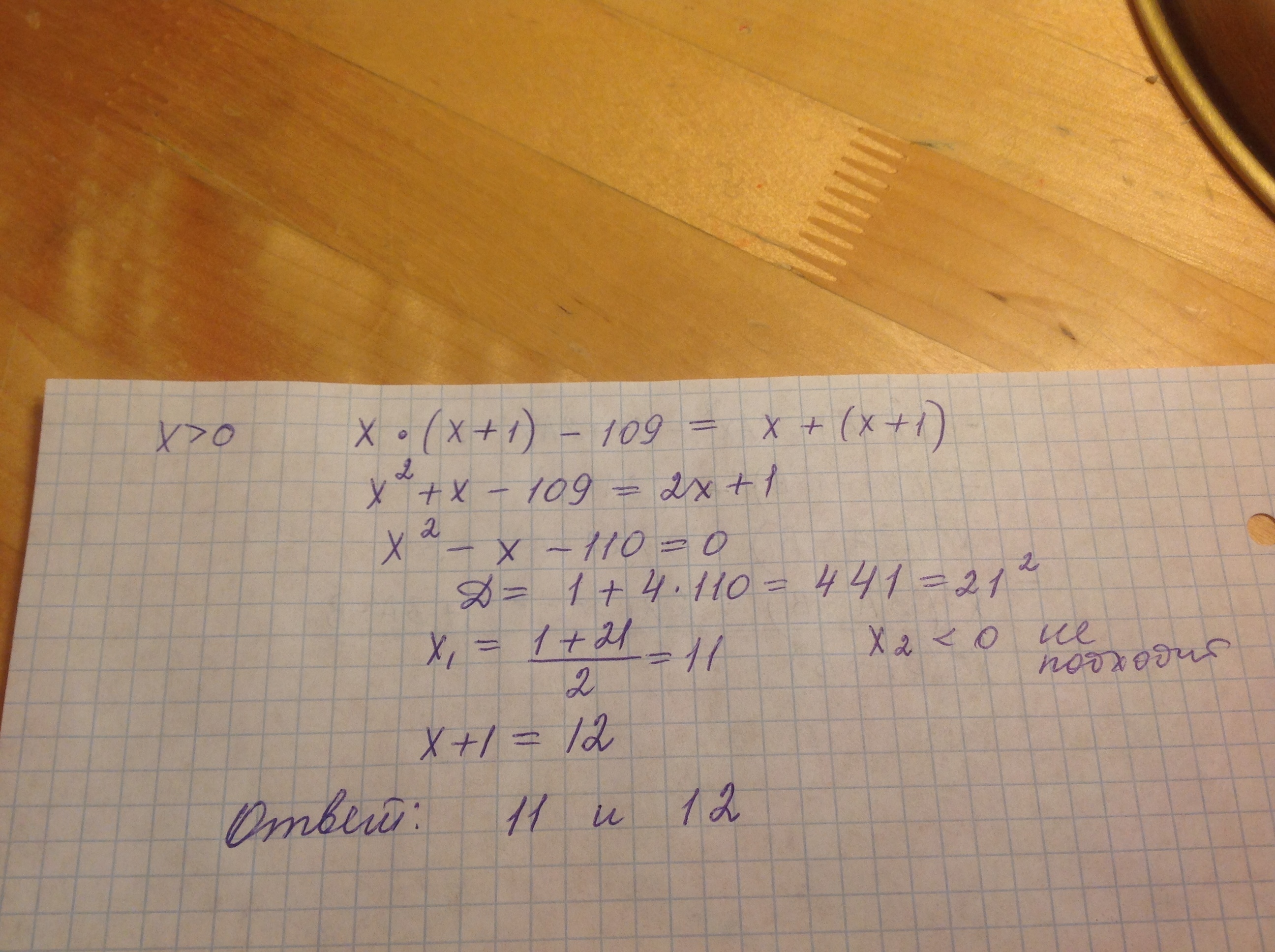 произведение 2-х последовательных натуральных чисел больше их суммы на 109. Найдите эти числа.