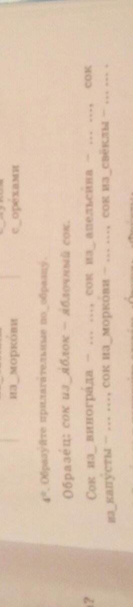 Сок из винограда - виноградный сок, сок из апельсина - апельсиновый сок, сок из капусты - капустный сок, сок из моркови - морковный сок, сок из свёклы - свекольный сок.
