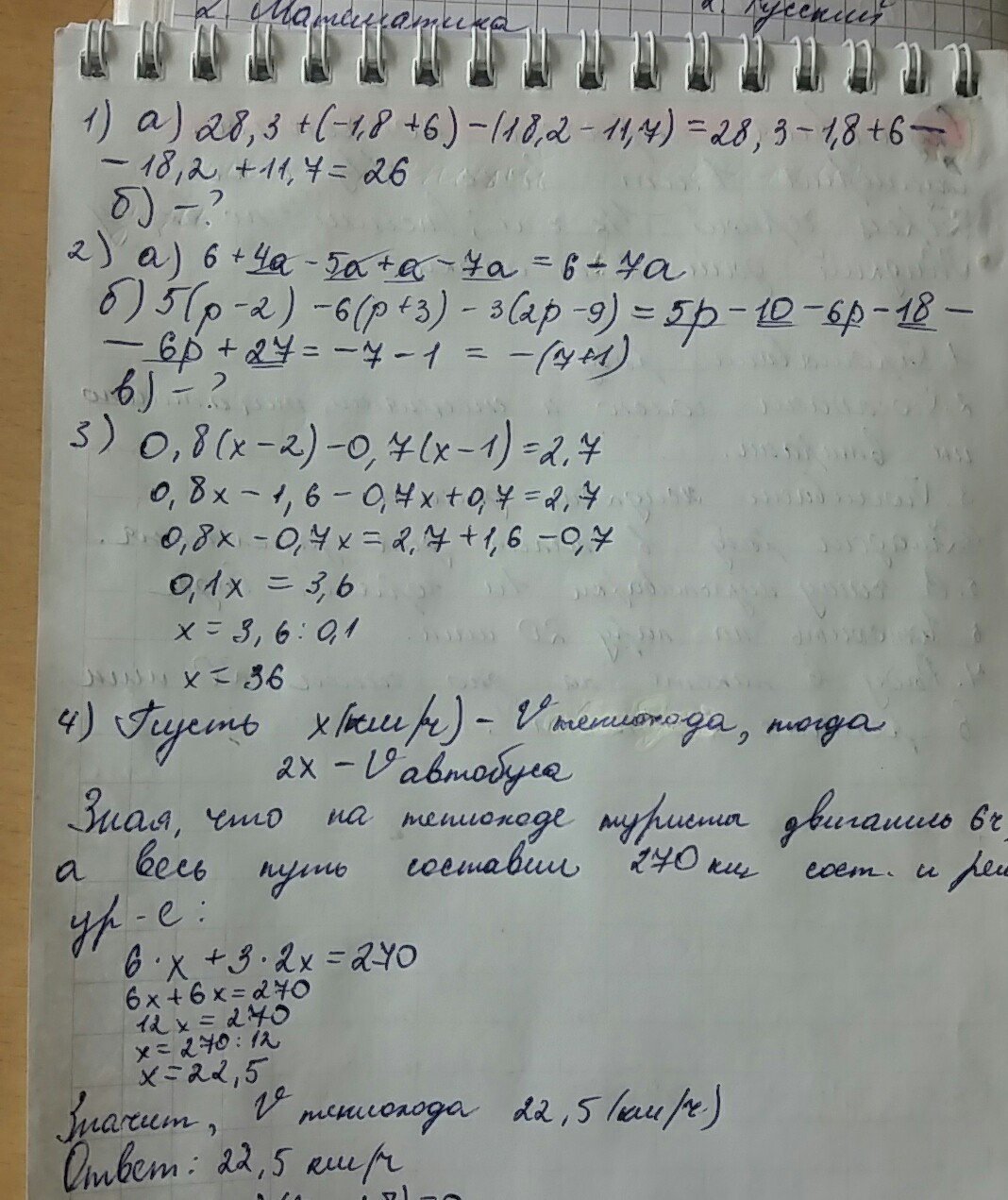 4. Туристы путь в 270 км проделали, двигаясь 6ч на теплоходе и 3ч – на автобусе. Какова была скорость теплохода, если она вдвое меньше скорости автобуса?