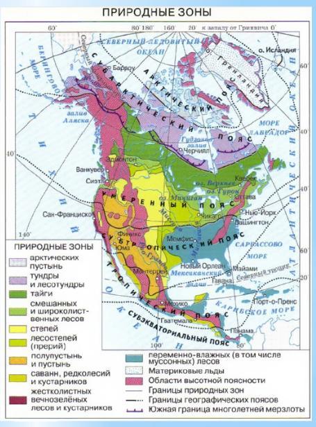 Большое разнообразие природы Северной Америки объясняется и большой площадью материка, и вытянутостью с севера на юг и с запада на восток, и нахождением его практически во всех климатических поясах начиная от арктического пояса на севере и заканчивая субэкваториальным поясом на юге .