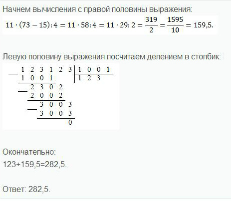123 123 : 1 001 + 11 - (73 - 15) : 4.