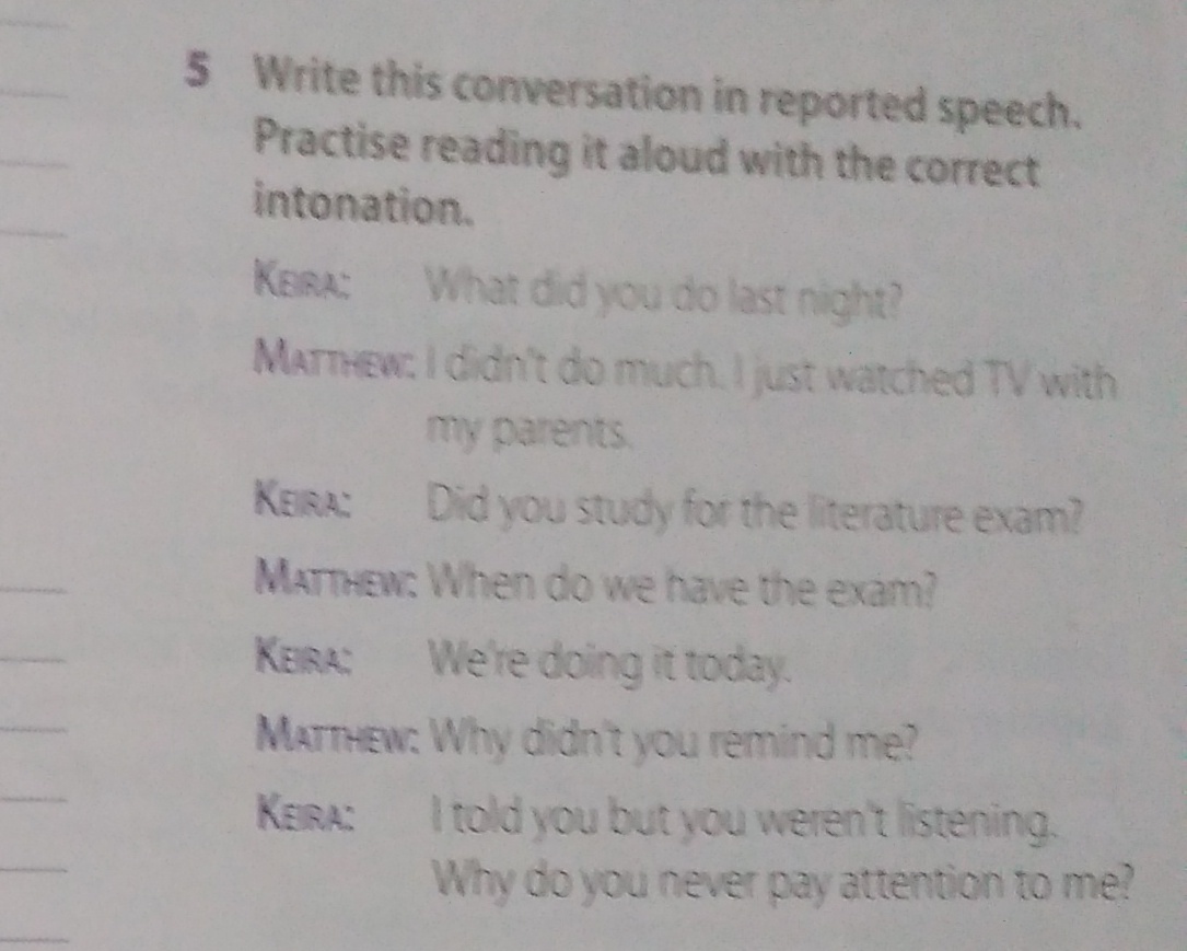 Keira asked Matthew what he had done the previous night.