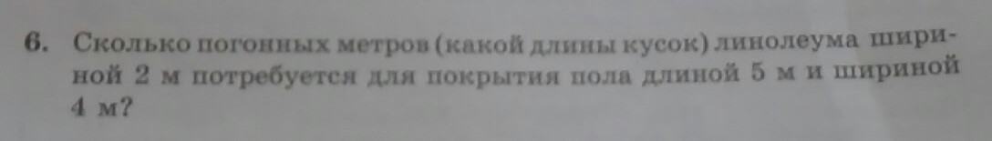 Помогите с решением. Сколько погонных метров (какой длинны кусок) линолеума шириной 2м потребуется для покрытия пола длиной 5м и шириной 4м?